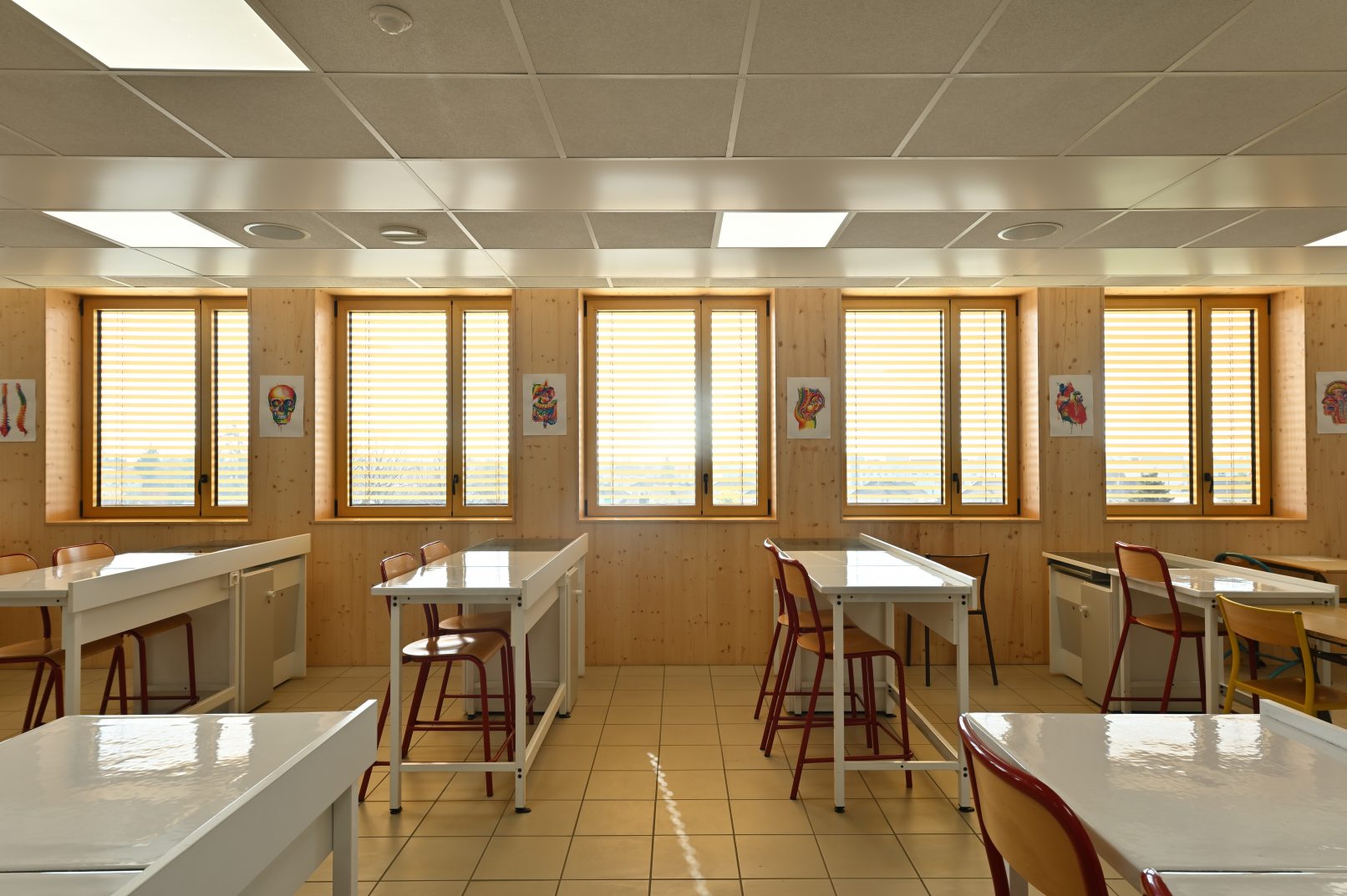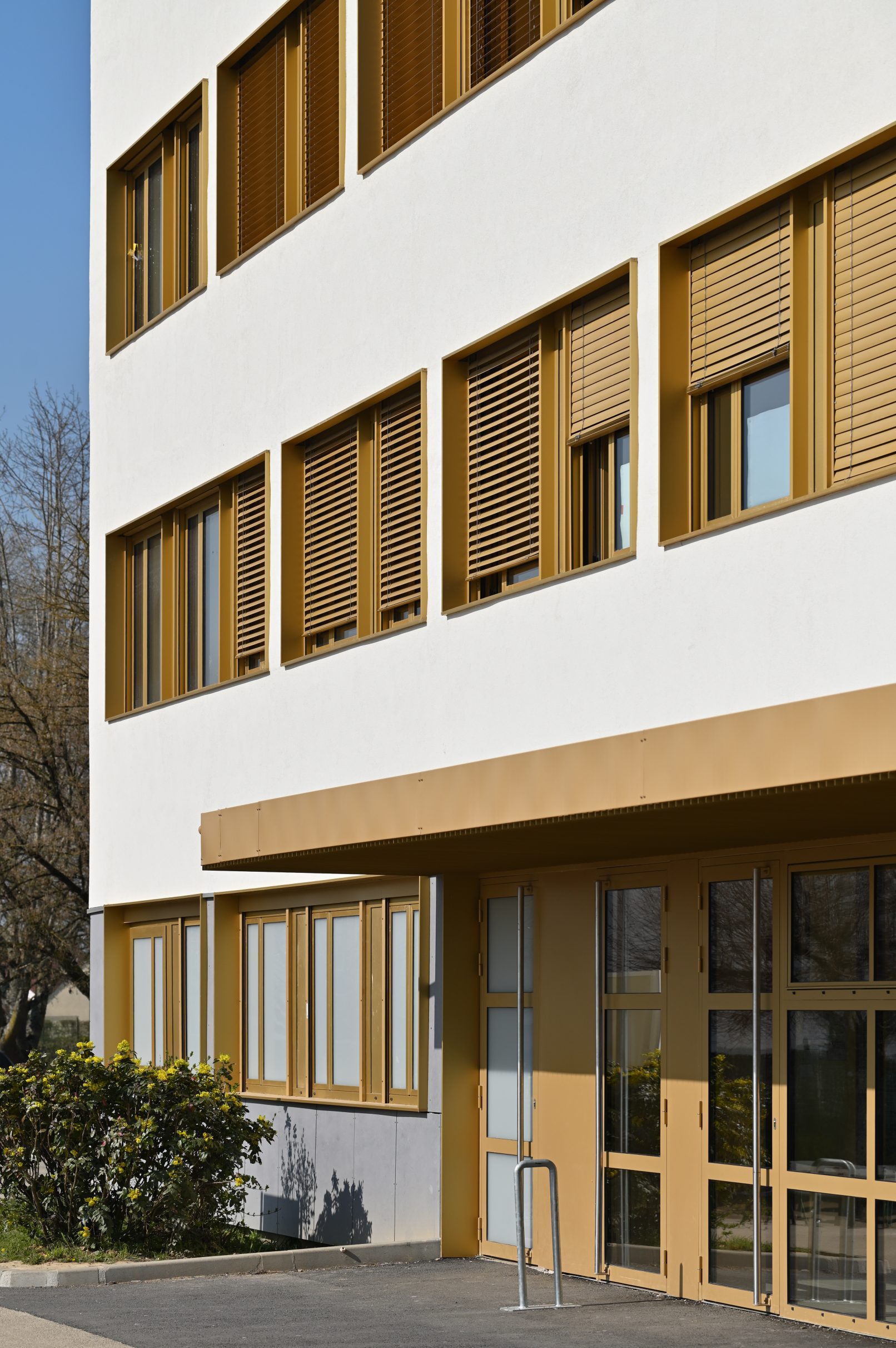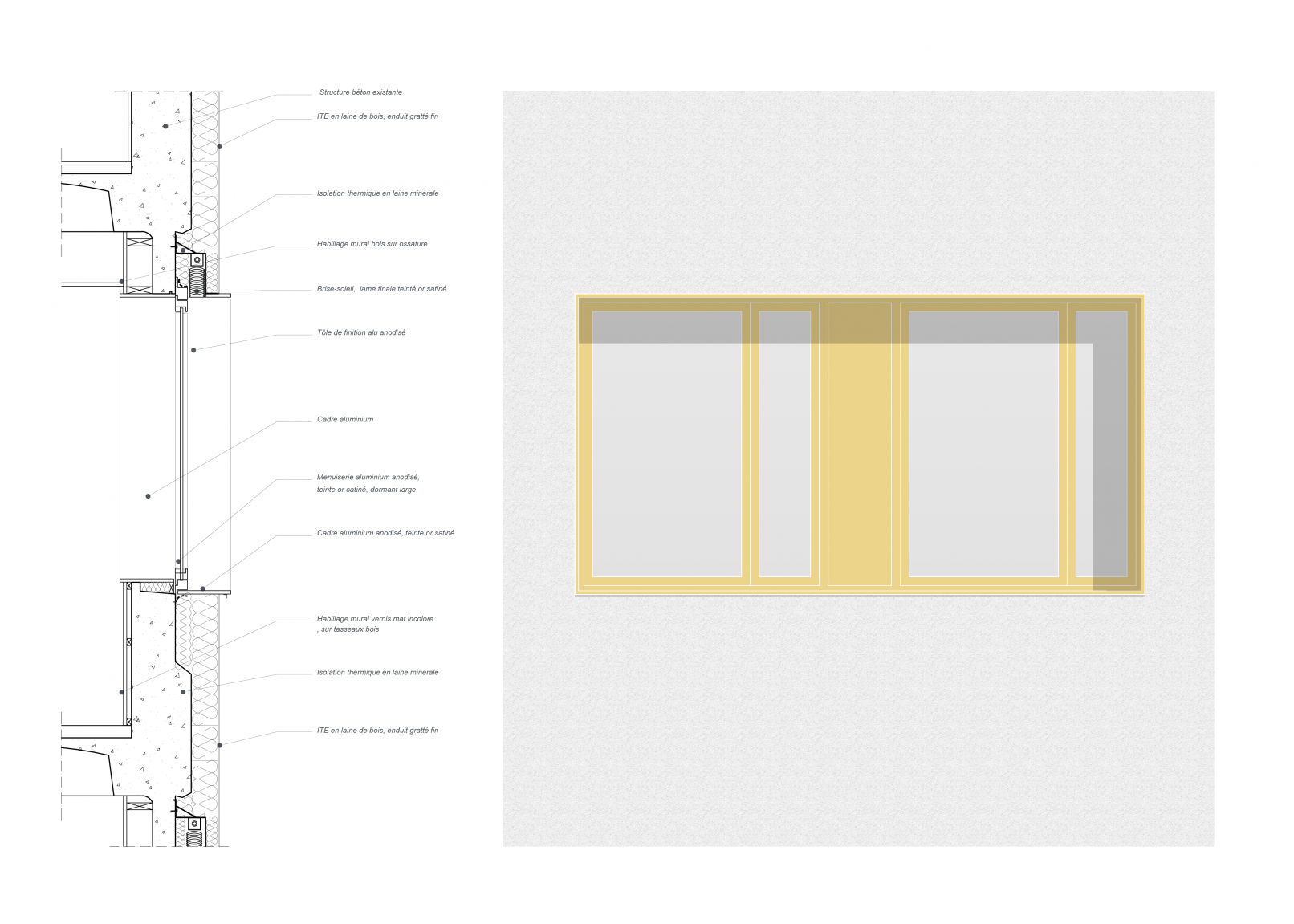 La façade principale dispose d’une grande visibilité depuis la rue, nous donnant ainsi l’opportunité d’amener une nouvelle identité architecturale au collège. La répétition de la fenêtre accompagnée de son encadrement en aluminium doré souligne l’horizontalité caractéristique du bâtiment. L’habillage mural étant détérioré à la suite du remplacement des menuiseries, nous le remplaçons par un revêtement bois afin de contraster légèrement avec l’environnement neutre des salles de classes. Le projet porte sur la rénovation et l’amélioration thermique de l’Externat du collège « Louis Pasteur » situé rue des Hortensias, à Saint Rémy. Elle consiste en l’intégration d’une isolation par l’extérieur que nous avons souhaité biosourcés en laine de bois, le remplacement des menuiseries et radiateurs, mise en place d’une ventilation double flux ainsi que sur la mise aux normes PMR, la mise en place d’EAS et la transformation de certains locaux.
