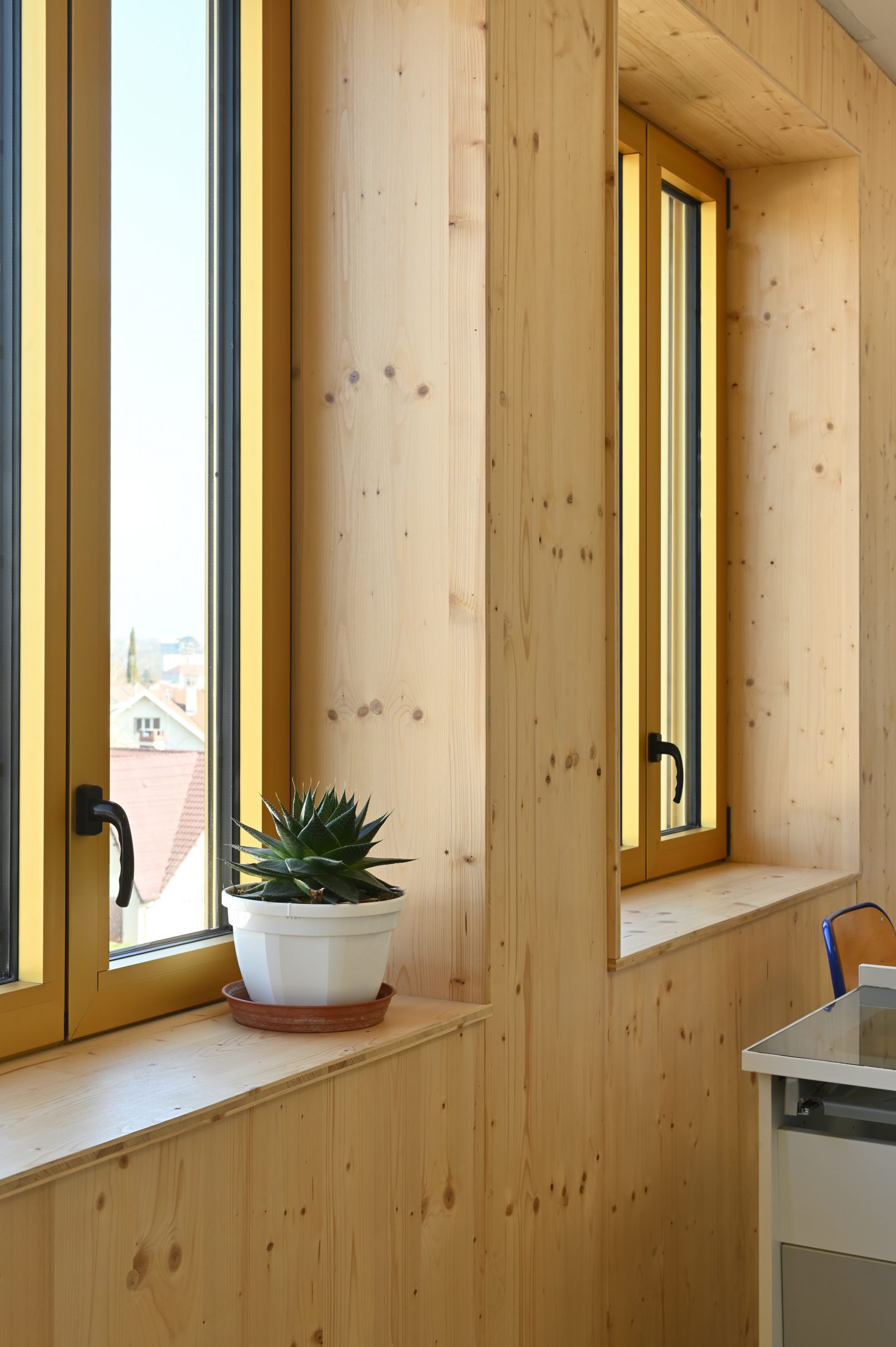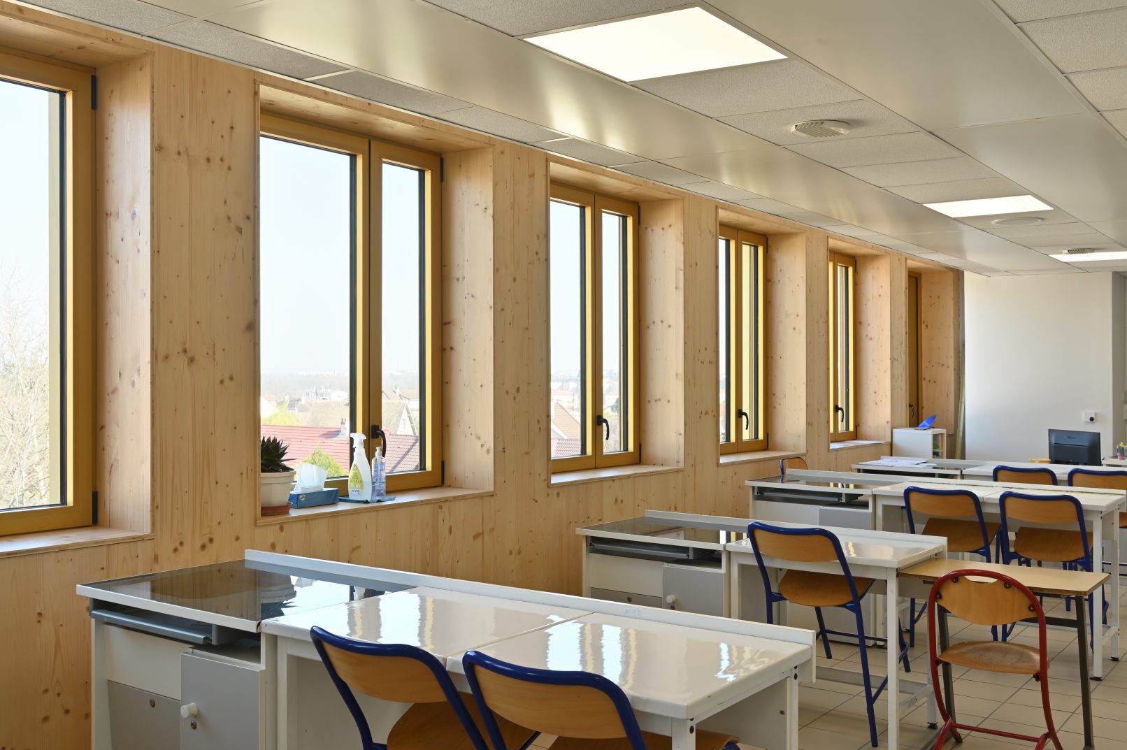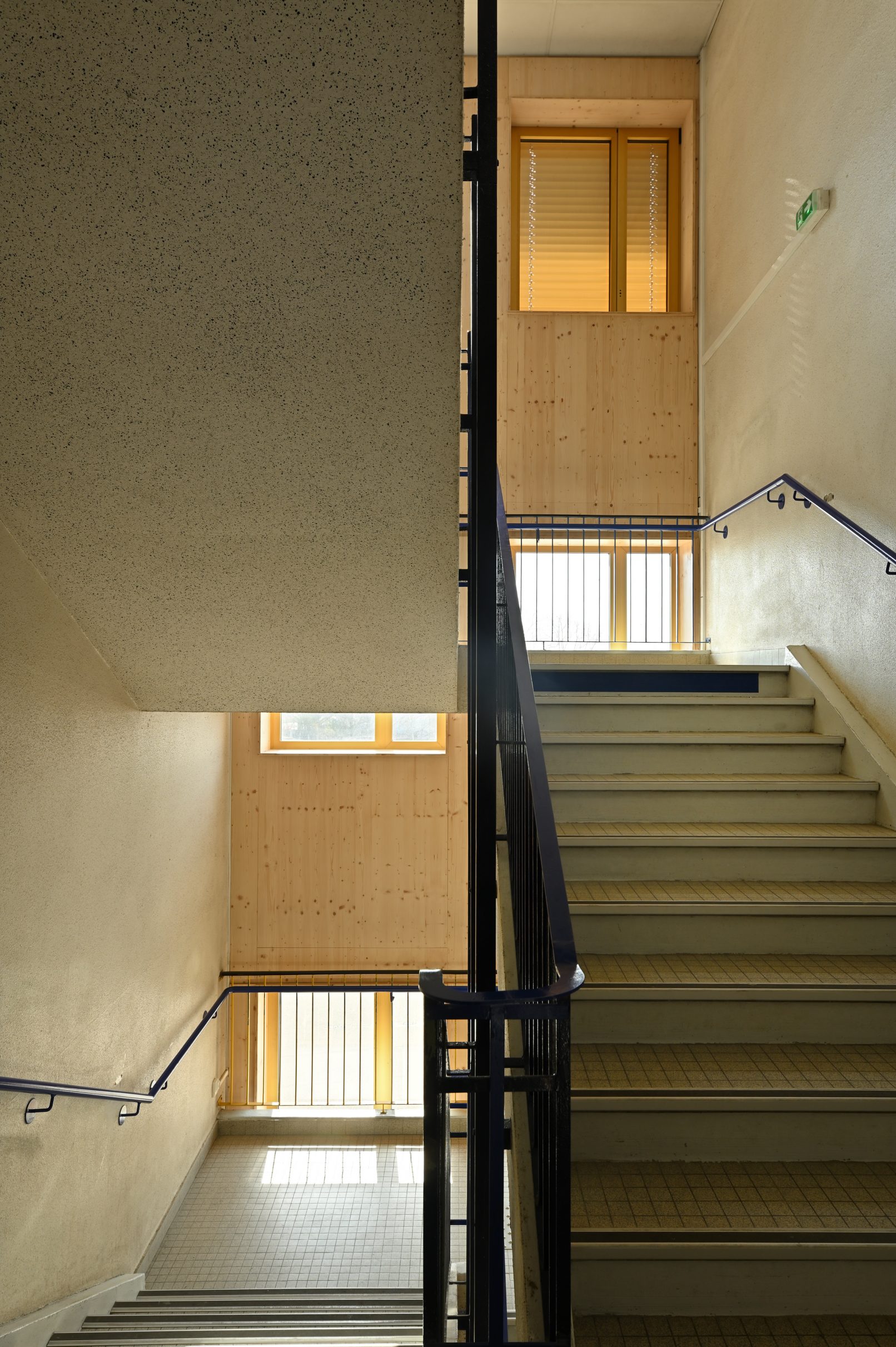 La façade principale dispose d’une grande visibilité depuis la rue, nous donnant ainsi l’opportunité d’amener une nouvelle identité architecturale au collège. La répétition de la fenêtre accompagnée de son encadrement en aluminium doré souligne l’horizontalité caractéristique du bâtiment. L’habillage mural étant détérioré à la suite du remplacement des menuiseries, nous le remplaçons par un revêtement bois afin de contraster légèrement avec l’environnement neutre des salles de classes. Le projet porte sur la rénovation et l’amélioration thermique de l’Externat du collège « Louis Pasteur » situé rue des Hortensias, à Saint Rémy. Elle consiste en l’intégration d’une isolation par l’extérieur que nous avons souhaité biosourcés en laine de bois, le remplacement des menuiseries et radiateurs, mise en place d’une ventilation double flux ainsi que sur la mise aux normes PMR, la mise en place d’EAS et la transformation de certains locaux.