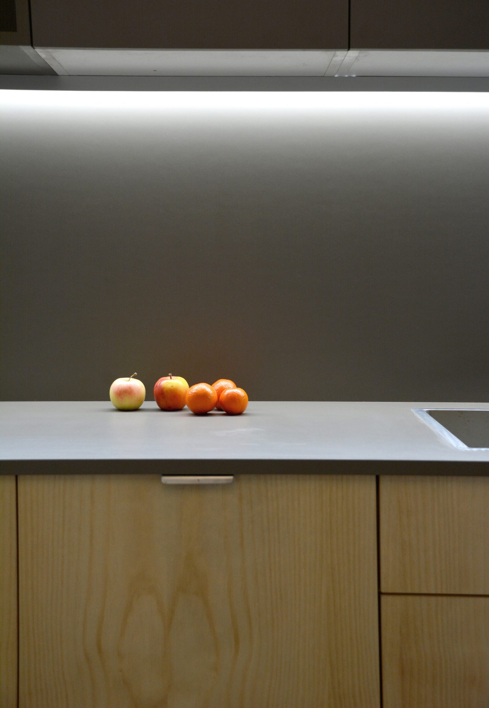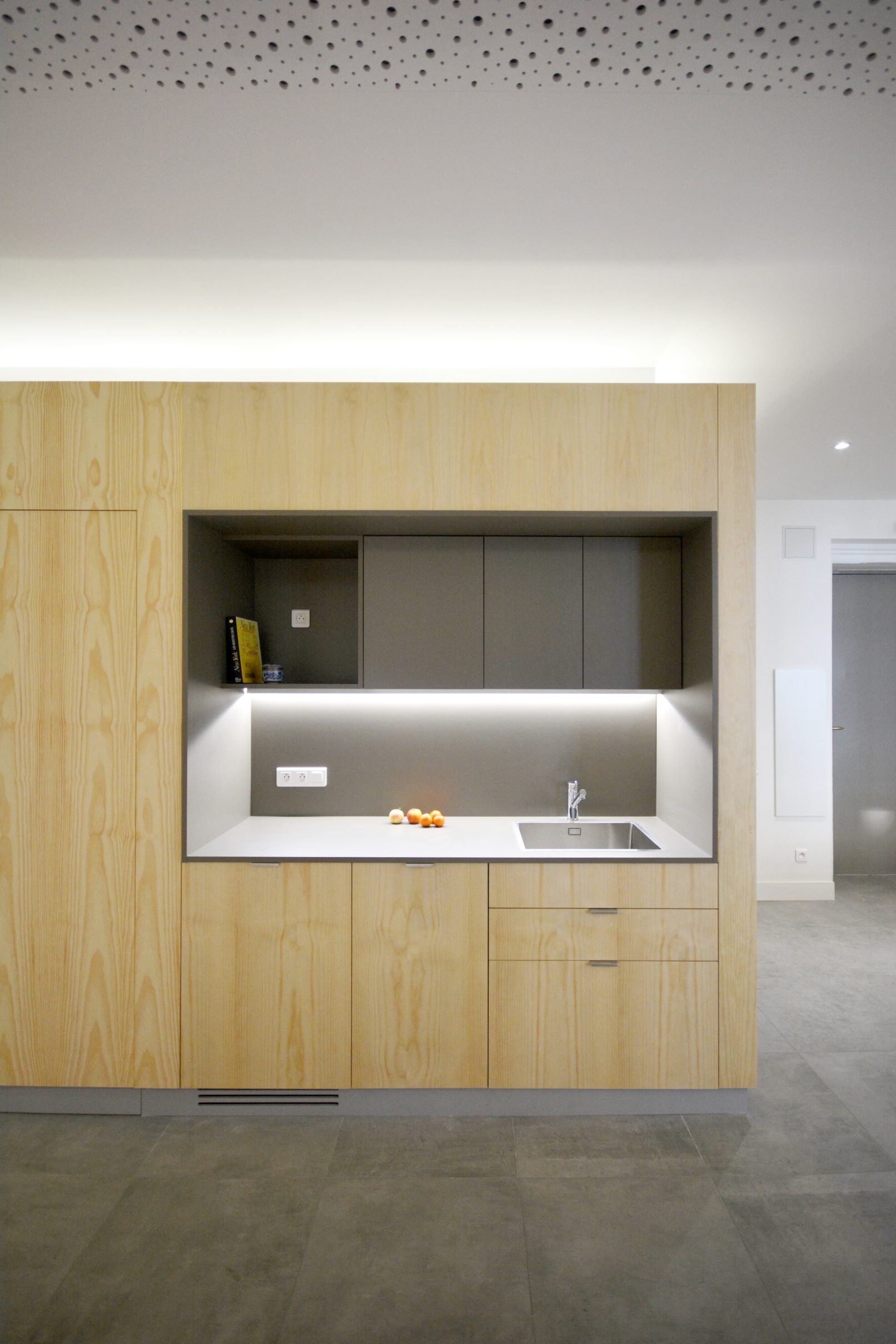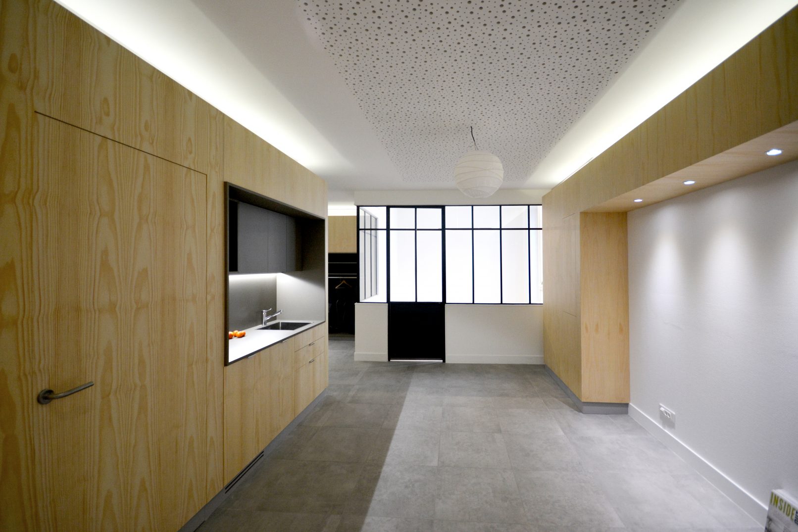 Cet ancien appartement bourgeois, situé dans un immeuble de la fin du XIXe siècle, où se trouvait alors un grand bazar a été entièrement repensé pour accueillir des bureaux. Le souhait des clients étaient de conserver au maximum les détails anciens tels que le parquet en bâton rompus, les cheminées, les fenêtres tout en apportant une ambiance contemporaine et chaleureuse. L’espace d’accueil se trouve encadré par un volume habillé d’un placage bois en pin déroulé contenant les locaux sanitaires, garde robe et technique. Puis, la salle de réunion transparente, se trouvant en face, permet d’éclairer naturellement les autres pièces. Dans cette configuration, le vitrage est traité acoustiquement afin de respecter la confidentialité nécessaire.