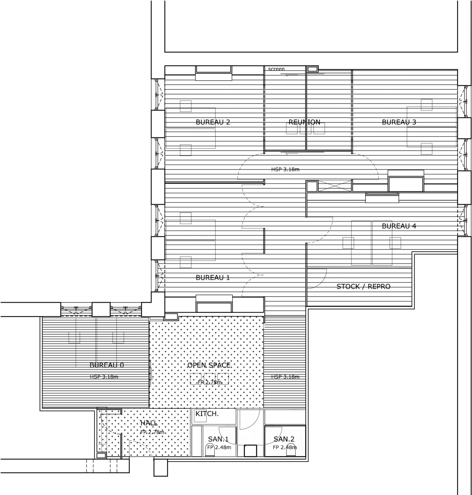 L’aménagement des bureaux se veut être minimaliste, et respectueux de l’existant en proposant de rénover le parquet ancien et de mettre en valeur les cheminées. Les menuiseries bois ont été remplacées en respectant les détails de l’époque : le profil mouton/gueule de loup, les espagnolettes ont été déposées et remontées suite à une découpe minutieuse des tableaux. Enfin, le confort thermique est assuré par l’intégration de brise-soleil orientables.