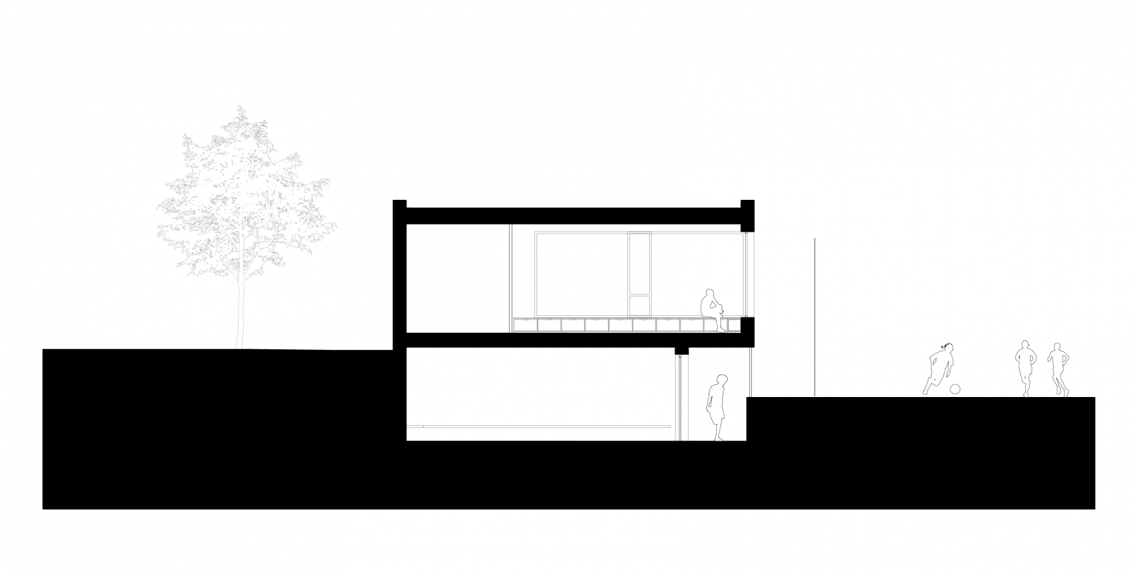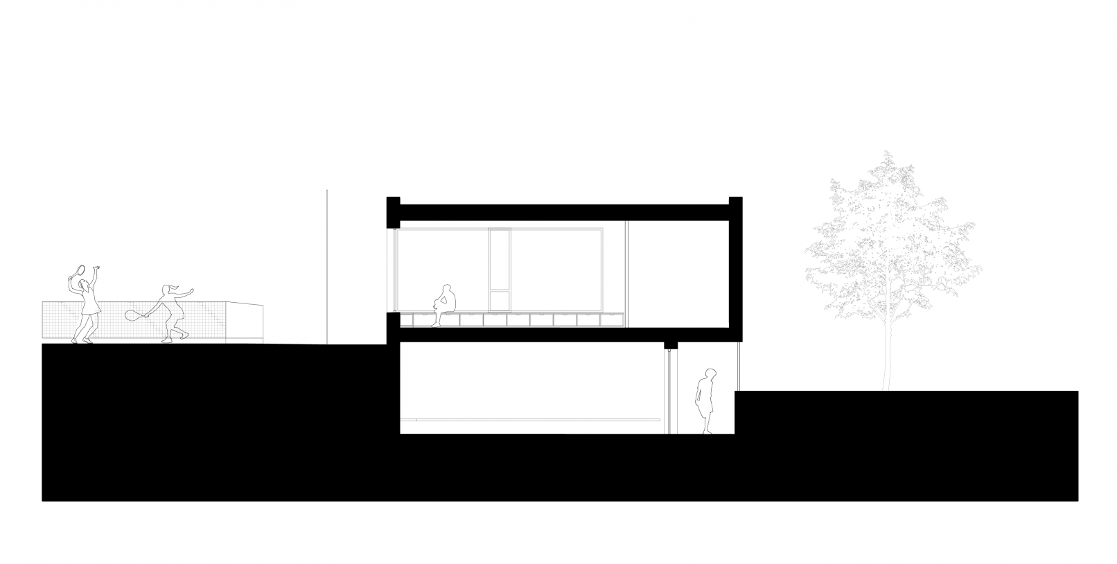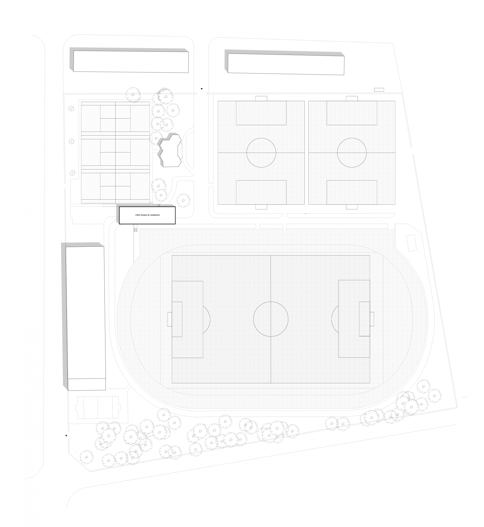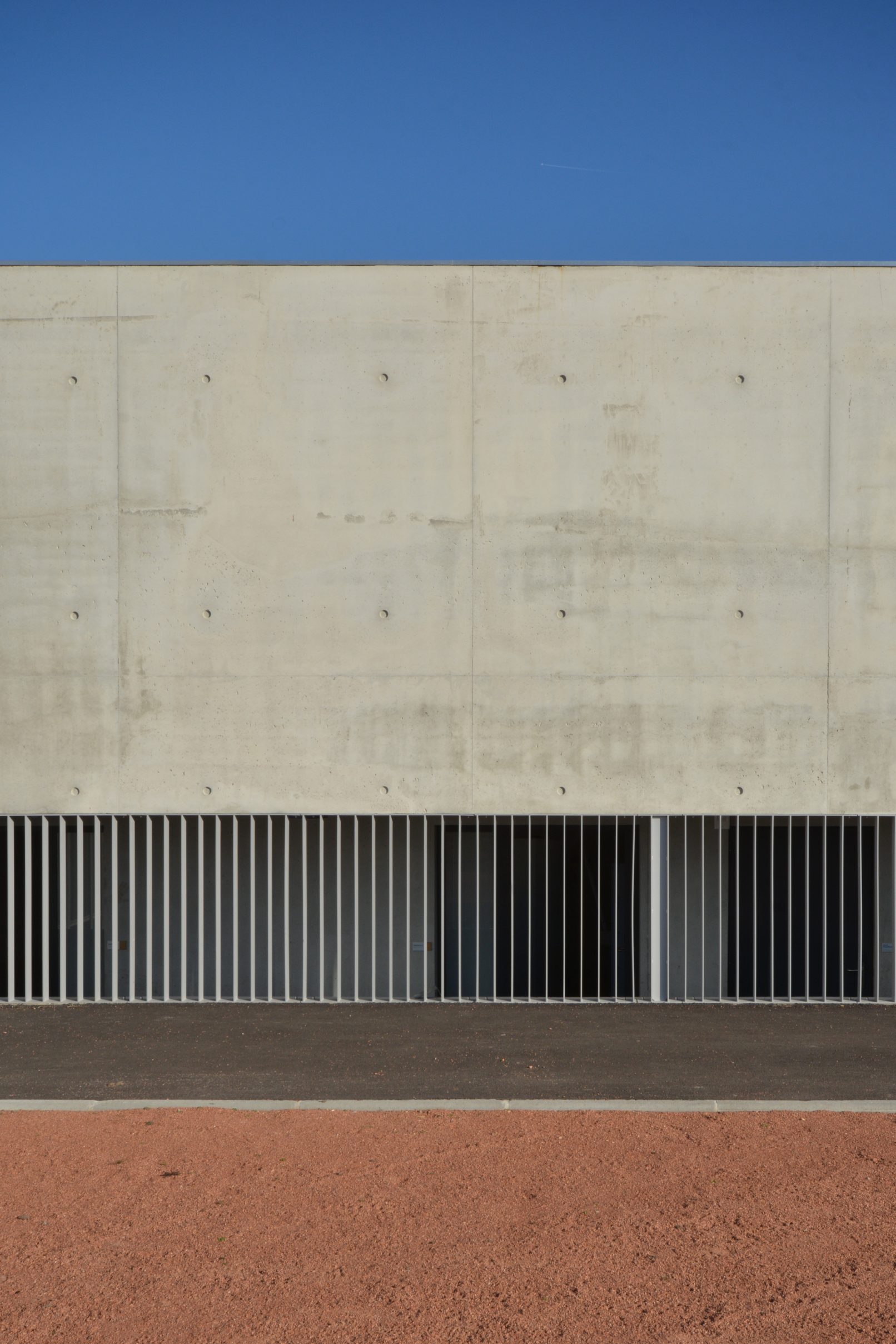Entre les terrains de football et les terrains de tennis, le bâtiment accueillant les club-houses, des vestiaires et des sanitaires publics se situe dans une zone clé de ce complexe sportif. Initialement installés dans des modulaires, les clubs de football et de tennis de la ville de Grigny profitent aujourd’hui d’espace généreux, lumineux, avec une vue imprenable sur les terrains de jeu respectifs. L’objectif premier de notre intervention était en effet de donner une réelle capacité d’accueil et de convivialité pour ces clubs sportifs. Le club football ayant également besoin de vestiaires, nous avons profité de la déclivité du terrain pour créer un niveau entier de vestiaire au rez-de-chaussée bas, en communication directe avec le terrain d’honneur de football. Les enjeux paysagers, écologiques, de performance thermique, d’entretien et d’économie nous ont immédiatement poussé à créer un seul et même bâtiment pour ces deux clubs qui ont malgré tout besoin d’indépendance. Chaque club a son orientation visuelle sur son espace extérieur, sa propre entrée ainsi que ses propres équipements de cuisine et sanitaires. Nous avons conçu ce bâtiment comme une entité compacte dont les percements orientent où mettent à distance, pour répondre à un programme commun mais contrasté. Le béton brut constituant à la fois la structure et l’enveloppe du bâtiment, le métal assurant le guidage ou les séparations des espaces extérieurs, et le bois composant les aménagements intérieurs (banquettes, faux plafonds, cuisines…), nous avons privilégié des matériaux bruts et pérennes.
