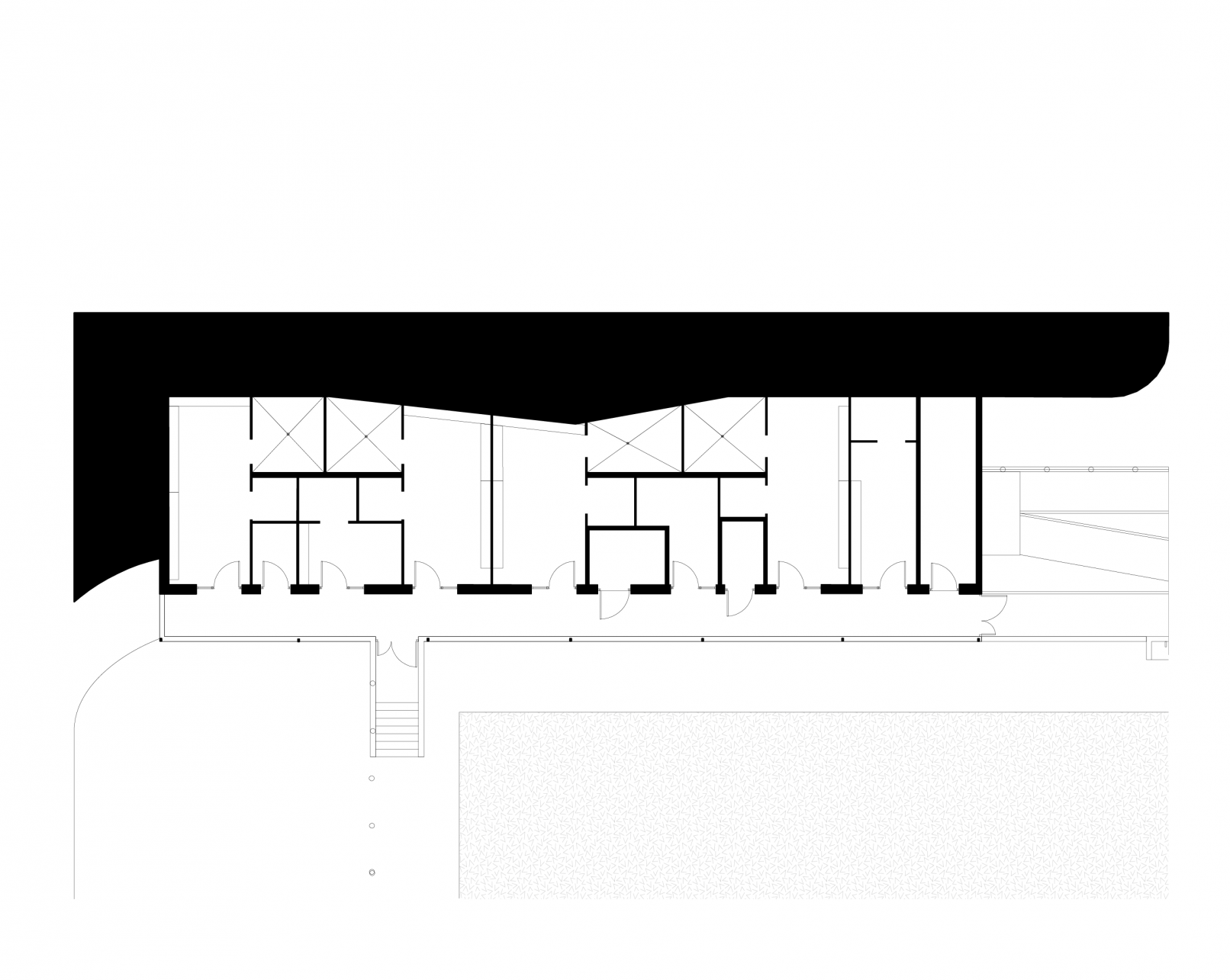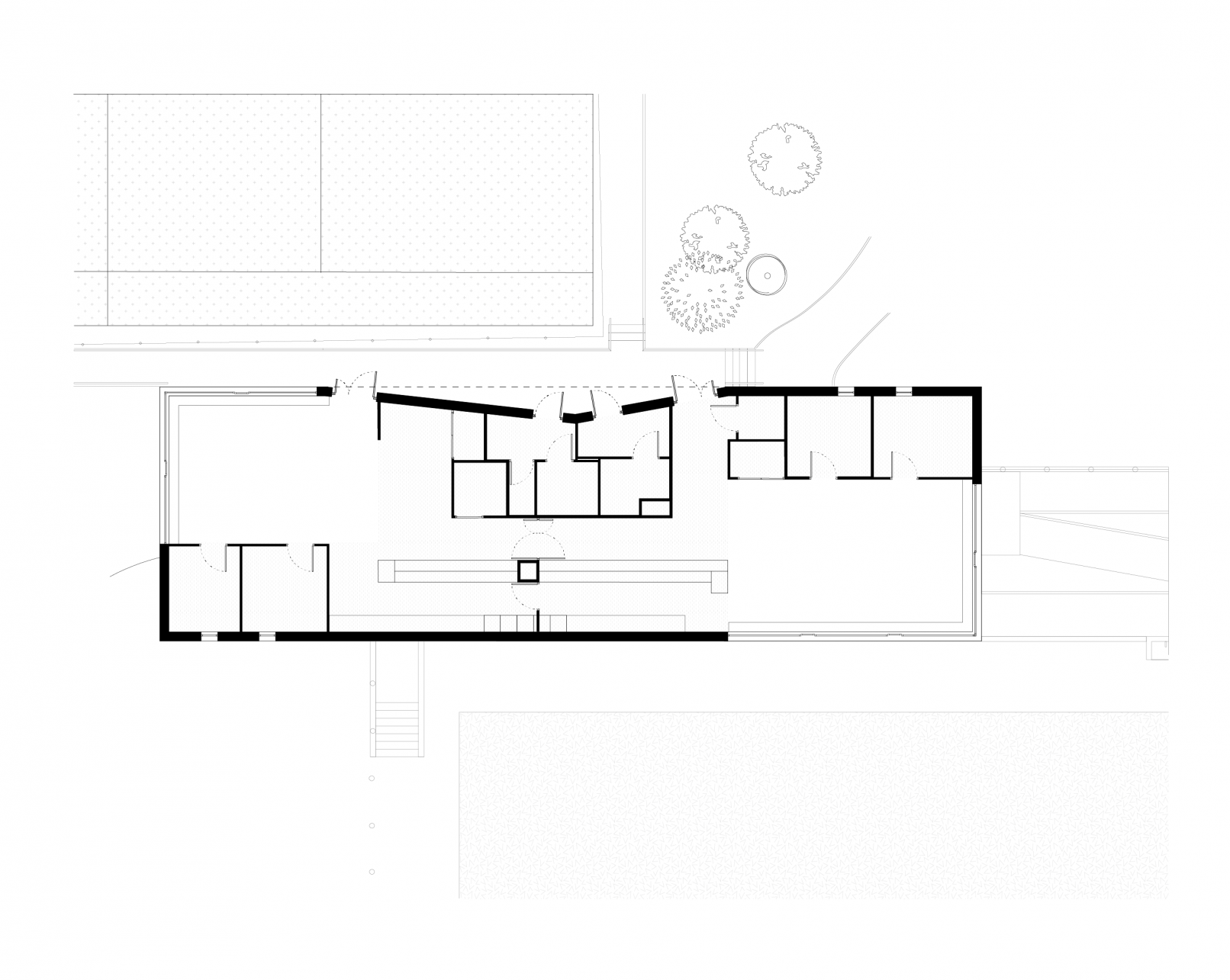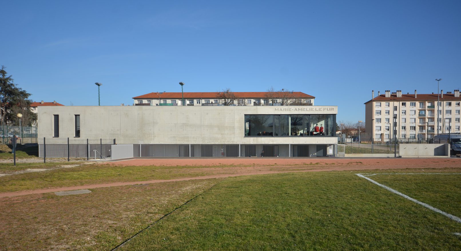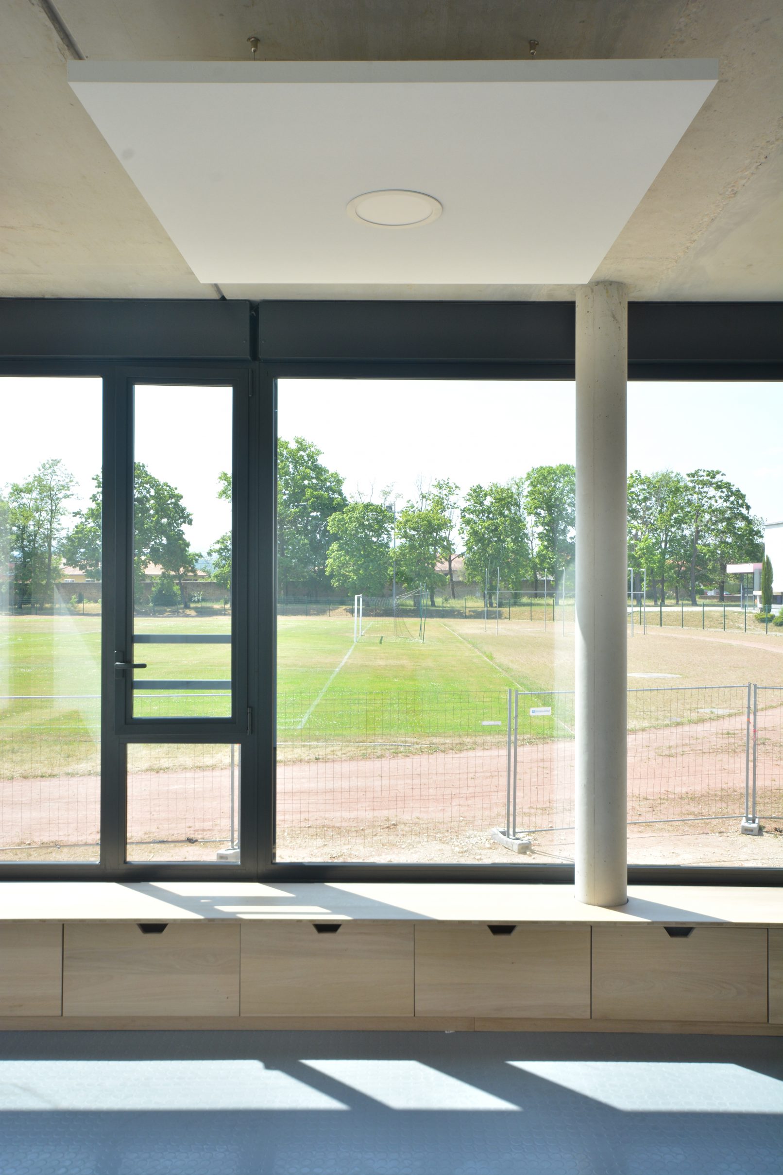 Entre les terrains de football et les terrains de tennis, le bâtiment accueillant les club-houses, des vestiaires et des sanitaires publics se situe dans une zone clé de ce complexe sportif. Initialement installés dans des modulaires, les clubs de football et de tennis de la ville de Grigny profitent aujourd’hui d’espace généreux, lumineux, avec une vue imprenable sur les terrains de jeu respectifs. L’objectif premier de notre intervention était en effet de donner une réelle capacité d’accueil et de convivialité pour ces clubs sportifs. Le club football ayant également besoin de vestiaires, nous avons profité de la déclivité du terrain pour créer un niveau entier de vestiaire au rez-de-chaussée bas, en communication directe avec le terrain d’honneur de football. Les enjeux paysagers, écologiques, de performance thermique, d’entretien et d’économie nous ont immédiatement poussé à créer un seul et même bâtiment pour ces deux clubs qui ont malgré tout besoin d’indépendance. Chaque club a son orientation visuelle sur son espace extérieur, sa propre entrée ainsi que ses propres équipements de cuisine et sanitaires. Nous avons conçu ce bâtiment comme une entité compacte dont les percements orientent où mettent à distance, pour répondre à un programme commun mais contrasté. Le béton brut constituant à la fois la structure et l’enveloppe du bâtiment, le métal assurant le guidage ou les séparations des espaces extérieurs, et le bois composant les aménagements intérieurs (banquettes, faux plafonds, cuisines…), nous avons privilégié des matériaux bruts et pérennes.