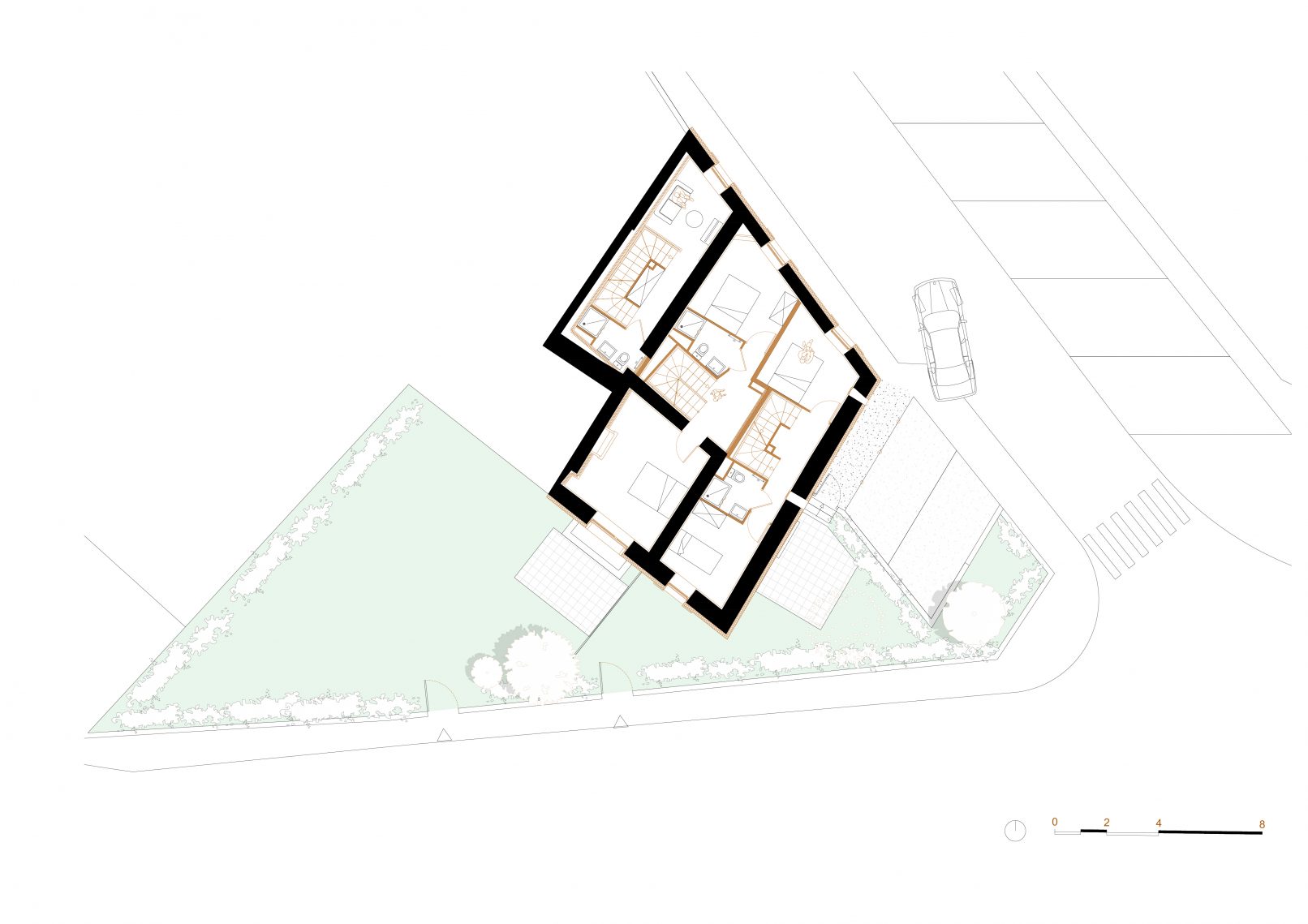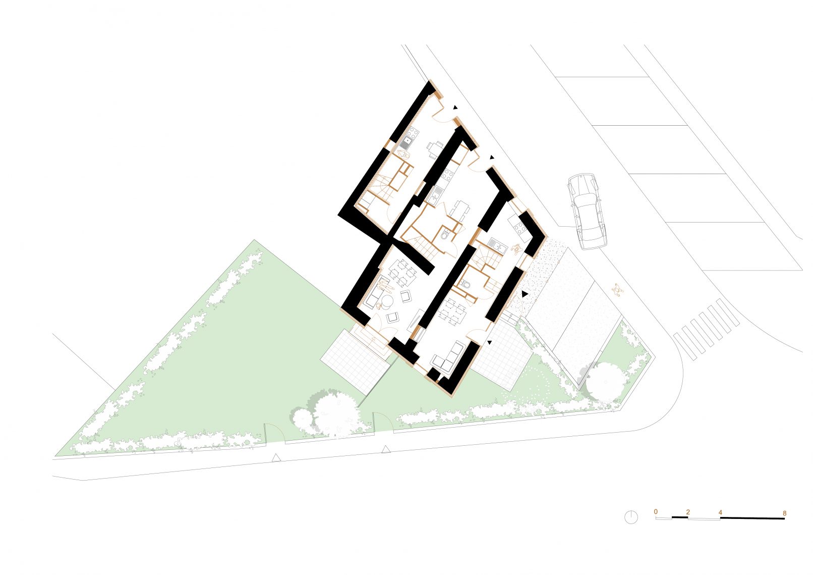 Ainsi, les trois logements se développent en triplex afin de minimiser l’impact sur la structure existante. Une isolation par l’extérieur avec un enduit teinte Blanc Craie est apportée en façade afin d’optimiser la surface intérieure des logements. Les entrées des logements sont disposées par des agrandissements ou créations d’ouvertures sur les deux façades principales afin d’affirmer la position urbaine et d’apporter davantage de lumière naturelle à l’intérieur. La similarité esthétique de ces nouvelles ouvertures ainsi que la présence d’auvents métalliques de teinte marron permettent de souligner la volumétrie de la maison. De plus, les menuiseries et les volets existants sont intégralement remplacés par des menuiseries en bois clair neuves en conservant le même système d’occultation, caractéristique de l’existant.
